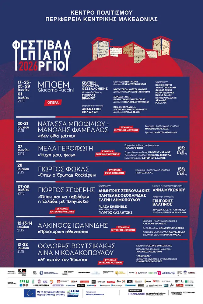Στα highlights ξεχωρίζει, φυσικά, η όπερα «La Bohème», ως η κεντρική και μεγαλύτερη παραγωγή, που συγκεντρώνει σημαντικούς καλλιτέχνες και αποτελεί ένα από τα κορυφαία γεγονότα του προγράμματος. Παράλληλα, ιδιαίτερη θέση έχουν οι μουσικές παραστάσεις και οι συναυλίες που καλύπτουν ένα ευρύ φάσμα, από το έντεχνο έως πιο σύγχρονες προσεγγίσεις, καθώς και το αφιέρωμα στον Γιώργο Σεφέρη, που φέρνει τον ποιητικό λόγο στο προσκήνιο. Συνολικά, το πρόγραμμα διαμορφώνει μια πολυφωνική εμπειρία που συνδυάζει διαφορετικές τέχνες, δημιουργώντας έναν ζωντανό διάλογο με το κοινό και αναδεικνύοντας τη δυναμική του Φεστιβάλ.