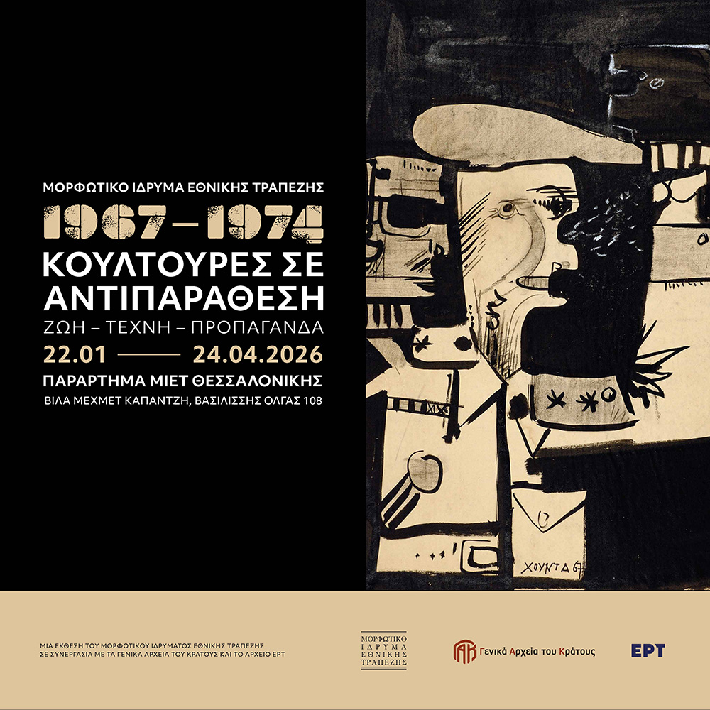 1967-1974. Κουλτούρες σε αντιπαράθεση | Ζωή - Τέχνη - ΠροπαγάνδαΗ περιοδική έκθεση του Μορφωτικού Ιδρύματος Εθνικής Τραπέζης «1967-1974. Κουλτούρες σε αντιπαράθεση. Ζωή – Τέχνη – Προπαγάνδα», μετά την εξαιρετικά επιτυχημένη πορεία της στην Αθήνα, παρουσιάζεται στο Παράρτημα του ΜΙΕΤ στη Θεσσαλονίκη (Βίλα Μεχμέτ Καπαντζή, Βασ. Όλγας 108) από τις 22 Ιανουαρίου έως και τις 24 Απριλίου 2026.