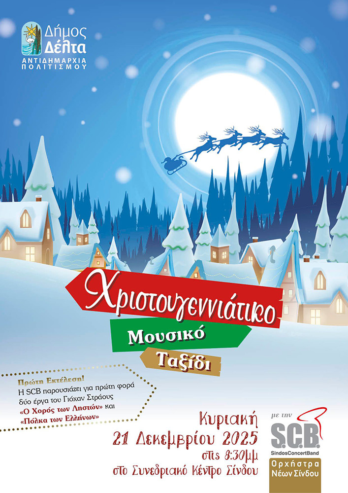 Ο Δήμος Δέλτα και η Αντιδημαρχία Πολιτισμού Δήμου Δέλτα σας προσκαλούν σε ένα “Χριστουγεννιάτικο μουσικό ταξίδι” με την Ορχήστρα Νέων Σίνδου Δήμου Δέλτα.