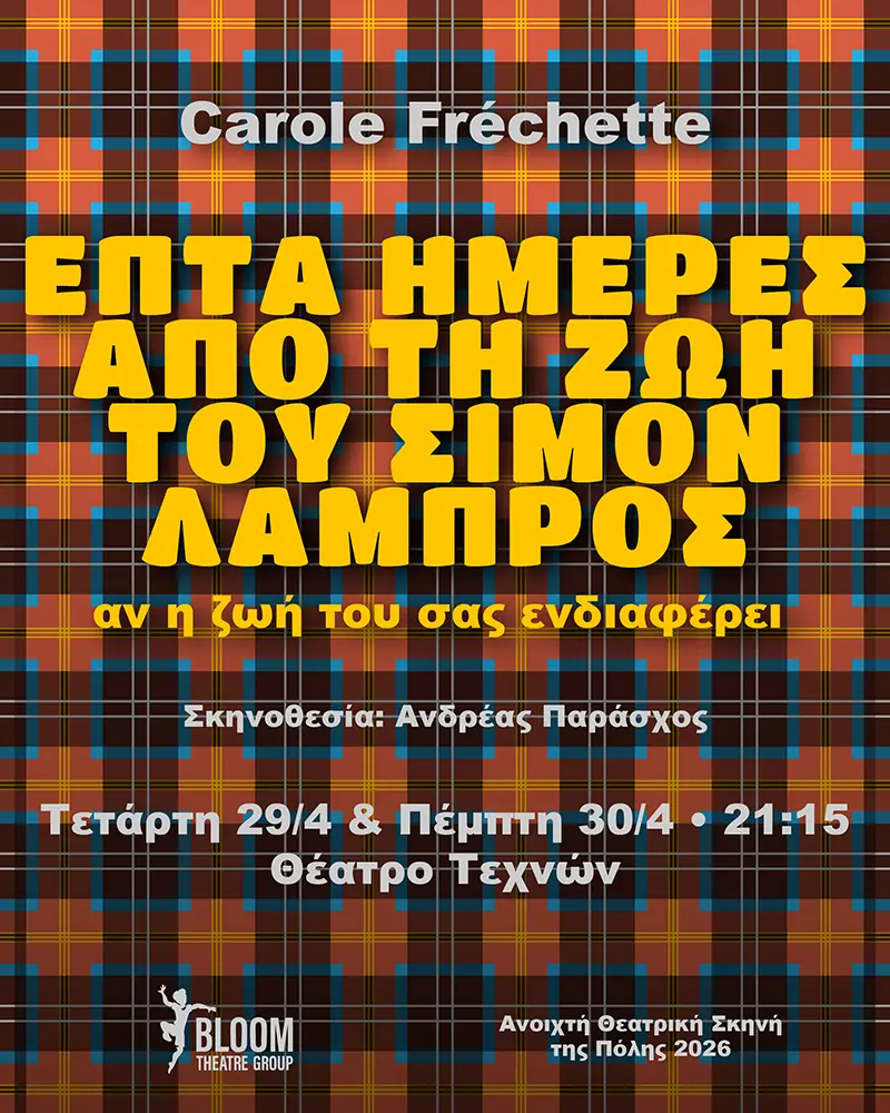Η Bloom Theatre Group συμμετέχει στην «Ανοιχτή Θεατρική Σκηνή της Πόλης 2026» με την υπαρξιακή κωμωδία της Carole Fréchette, «Επτά ημέρες από τη ζωή του Σιμόν Λαμπρός – αν η ζωή του σας ενδιαφέρει». Πρόκειται για ένα από τα πιο αναγνωρισμένα έργα του σύγχρονου γαλλόφωνου καναδικού θεάτρου, που παρουσιάζεται στις 29 και 30 Απριλίου στο Θέατρο Τεχνών, σε μετάφραση Ξανθίππης Κουτούφη και σκηνοθεσία Ανδρέα Παράσχου. Με μοναδική ισορροπία ανάμεσα στο χιούμορ και τη μελαγχολία, το έργο συνδυάζει τον ρεαλισμό με την ποιητική γραφή και μια έντονα ανθρώπινη ματιά στις μικρές καθημερινές μάχες της ζωής.