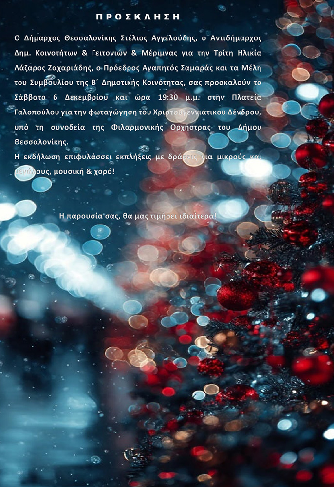 Φωταγώγηση του Χριστουγεννιάτικου Δέντρου της Β' Δημοτικής ΚοινότηταςΟ Δήμαρχος Θεσσαλονίκης Στέλιος Αγγελούδης, ο Αντιδήμαρχος Δημοτικών Κοινοτήτων & Γειτονιών & Μέριμνας για την Τρίτη Ηλικία Λάζαρος Ζαχαριάδης, ο Πρόεδρος Αγαπητός Σαμαρά και τα Μέλη του Συμβουλίου της Β’ Δημοτική Κοινότητας σας προσκαλούν το Σάββατο 6 Δεκεμβρίου 2025 και ώρα 19:30 στην Πλατεία Γαλοπούλου για την φωταγώγηση του Χριστουγεννιάτικου Δέντρου υπό την συνοδεία της Φιλαρμονικής Ορχήστρας του Δήμου Θεσσαλονίκης.