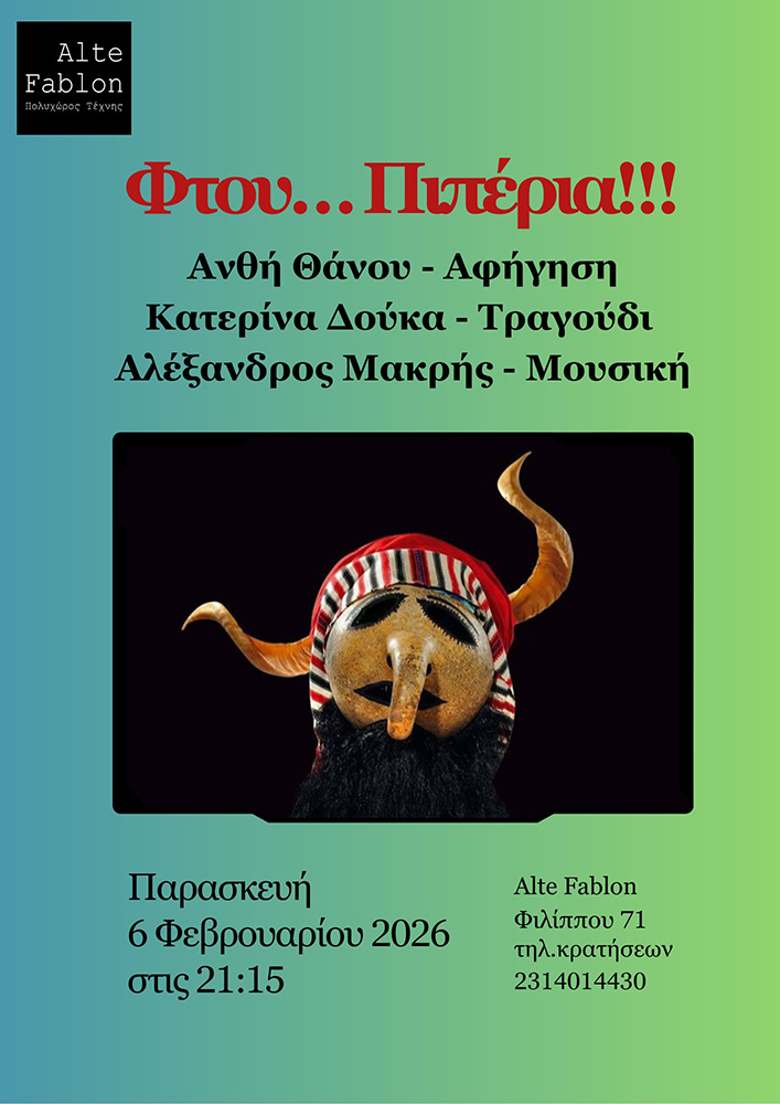Μια αποκριάτικη, πονηρή βραδιά θα ζήσουμε την Παρασκευή 6 Φεβρουαρίου 2026 στις 21:15 στον Πολυχώρο Τέχνης Alte Fablon, αυστηρά για ενήλικες, όπου η Ανθή Θάνου αφηγείται και η Κατερίνα Δούκα με τον Αλέξανδρο Μακρή τραγουδούν όσα «όλα επιτρέπονται».