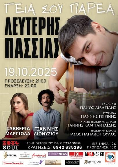 Με αφορμή τον δεύτερο προσωπικό δίσκο του που μόλις κυκλοφόρησε, ο Λευτέρης Πασσιάς στήνει ένα γλέντι για να το γιορτάσει! Καλεσμένοι στην Παρέα του, η Σαββέρια Μαργιολά και ο Γιάννης Διονυσίου, ενώνουν τις φωνές τους σε ένα live που θα μείνει αξέχαστο! 19 Οκτωβρίου 2025 στο Soul skg μια εκλεκτή ομάδα μουσικών σε περιμένει να τραγουδήσουμε, να συγκινηθούμε, να γελάσουμε, να ζήσουμε! Έτσι όπως μόνο οι παρέες οι καρδιακές ξέρουν να κάνουν! Εκεί κατά τις 22.00 θα ακουστούν οι πρώτες νότες!