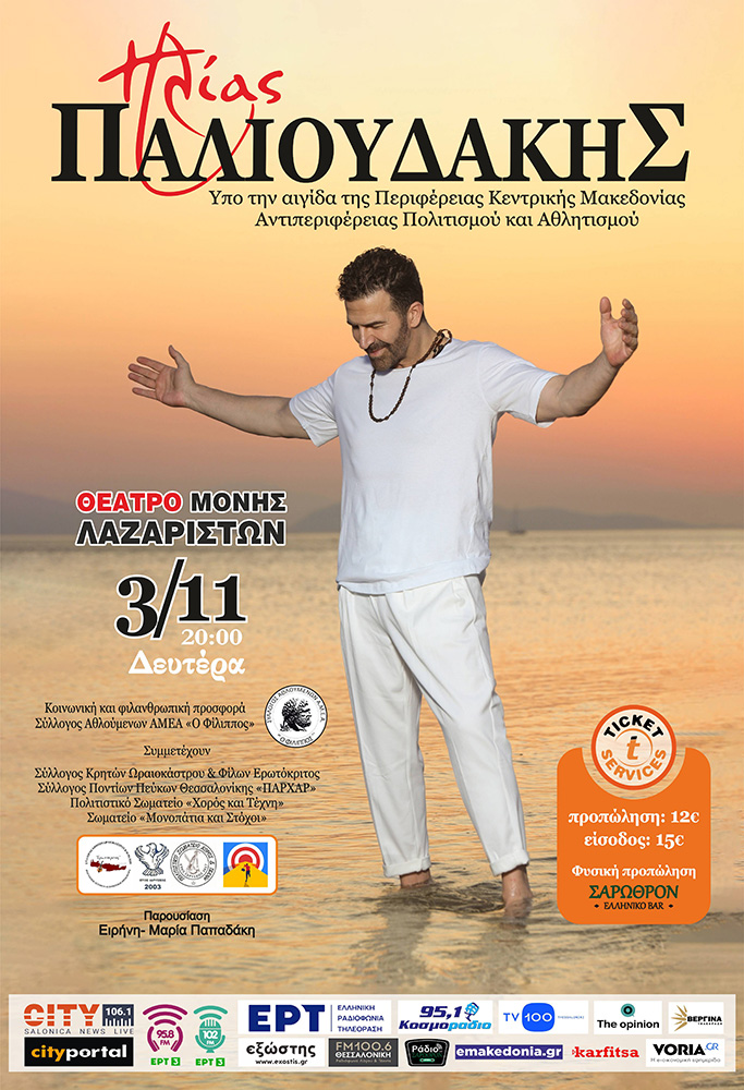 Την Δευτέρα 3 Νοεμβρίου 2025, ο καταξιωμένος ερμηνευτής Ηλίας Παλιουδάκης ανεβαίνει στη σκηνή του Θεάτρου της Μονής Λαζαριστών για να μας χαρίσει μια βραδιά όπου το λαϊκό, το έντεχνο και το παραδοσιακό συναντιούνται με τον δικό του, μοναδικό τρόπο.
