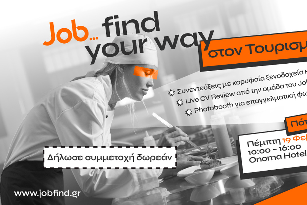 Μετά το 1ο career event «Job…find Your Way μετά τις σπουδές» στη Θεσσαλονίκη, που συγκέντρωσε 600+ υποψηφίους, το Jobfind.gr παρουσιάζει ένα ακόμη δυναμικό event αφιερωμένο στον Τουρισμό & τη Φιλοξενία, με στόχο να φέρει σε άμεση επαφή υποψηφίους με ξενοδοχεία και τουριστικές επιχειρήσεις που αναζητούν προσωπικό για τη σεζόν 2026.