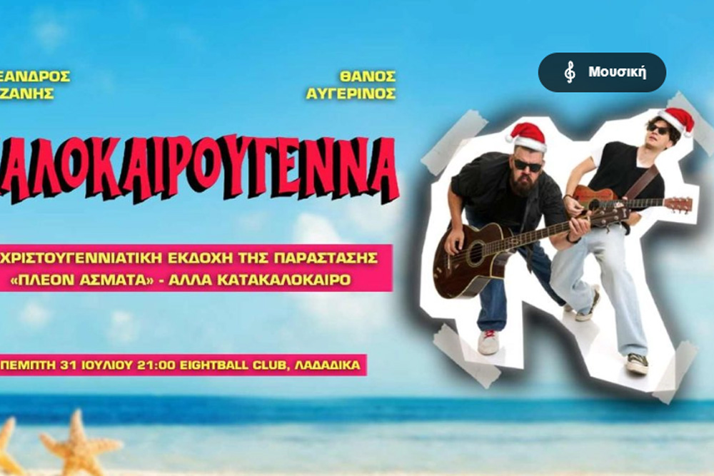 ΚαλοκαιρούγενναΗ χριστουγιεννιάτικη εκδοχή της παράστασης «Πλέον Άσματα» με τους Χαριζάνη / Αυγερινό έρχεται στην καρδιά του καλοκαιριού για ένα μουσικό κωμικό event γεμάτο εορταστική διάθεση, χωρίς κανέναν απολύτως λόγο. Θα ακουστεί όλο το υλικό από τα «Πλέον Άσματα», κάλαντα, χριστουγεννιάτικα τραγούδια ενώ εάν βρούμε θα φέρουμε και μελομακάρονα. Αλήθεια.