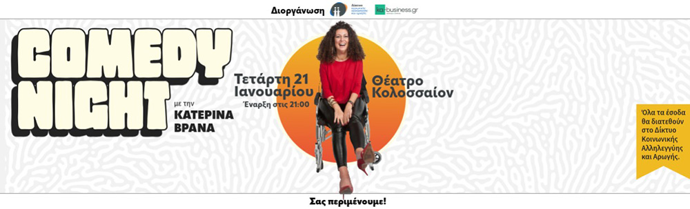 Κατερίνα Βρανά - Stand Up ComedyΗ Κατερίνα Βρανά, μία από τις πιο ξεχωριστές και αναγνωρίσιμες παρουσίες της ελληνικής stand-up comedy, έρχεται στη Θεσσαλονίκη για μία μοναδική παράσταση με φιλανθρωπικό σκοπό. Με το αιχμηρό της χιούμορ, την αυθεντικότητα και την αμεσότητά της, η Κατερίνα Βρανά μιλά για την καθημερινότητα, τη ζωή, τις προκλήσεις και τις ανθρώπινες σχέσεις, προσφέροντας άφθονο γέλιο αλλά και ουσιαστική τροφή για σκέψη.
