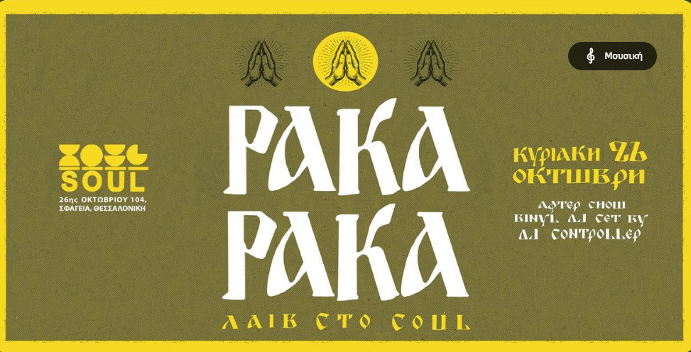 Paka Paka + Dj ControllerΤην Κυριακή 26 Οκτωβρίου 2025 οι Paka Paka, συγκρότημα από τη Θεσσαλονίκη που παίζει χορευτική ηλεκτρονική μουσική, επιστρέφουν στη σκηνή του Soul. Την οπτική εμπειρία θα αναλάβει ο σχεδιαστής φωτισμού Νίκος Lopez Κεχαγιάς.