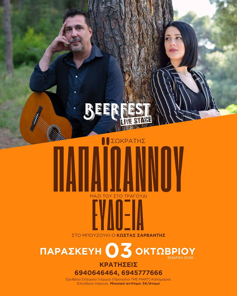 Σωκράτης Παπαϊωάννου - ΕυδοξίαΤην Παρασκευή 3 Οκτωβρίου 2025 στις 21:00 σας περιμένουμε στο Beerfest Live Stage για μια όμορφη μουσική βραδιά.