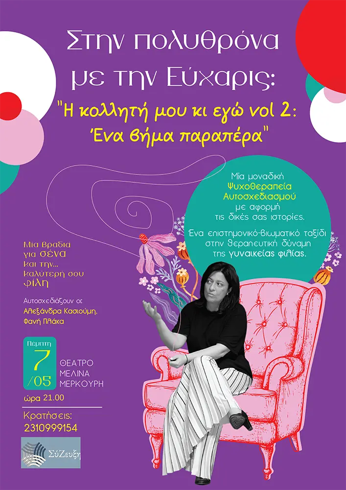 Όλα αυτά και άλλα ερωτήματα θα απαντηθούν επί σκηνής στην πολιτιστική ψυχοθεραπεία με θέμα «Η κολλητή μου κι Εγώ» .