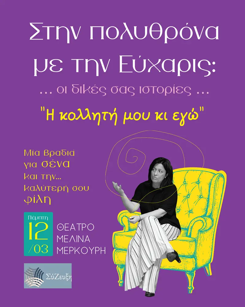 Μετά τον Γιώργο Καπουτζίδη, τον Χριστόφορο Παπακαλιάτη, την Χαρούλα Αλεξίου, και απαντώντας σε πολλά αιτήματα του κόσμου της Θεσσαλονίκης, στην Πολυθρόνα με την Εύχαρις κάθονται οι δικές σας ιστορίες σε μία σειρά από μοναδικές ψυχοθεραπείες αυτοσχεδιασμού, όπου οι επιστημονικές αλήθειες γίνονται βίωμα μέσα από τον θεατρικό αυτοσχεδιασμό, με αφορμή τις ιστορίες του κοινού. Οι θεατές συμμετέχουν, μαθαίνουν, ανακαλύπτουν, ψυχαγωγούνται, χωρίς να εκτίθενται.