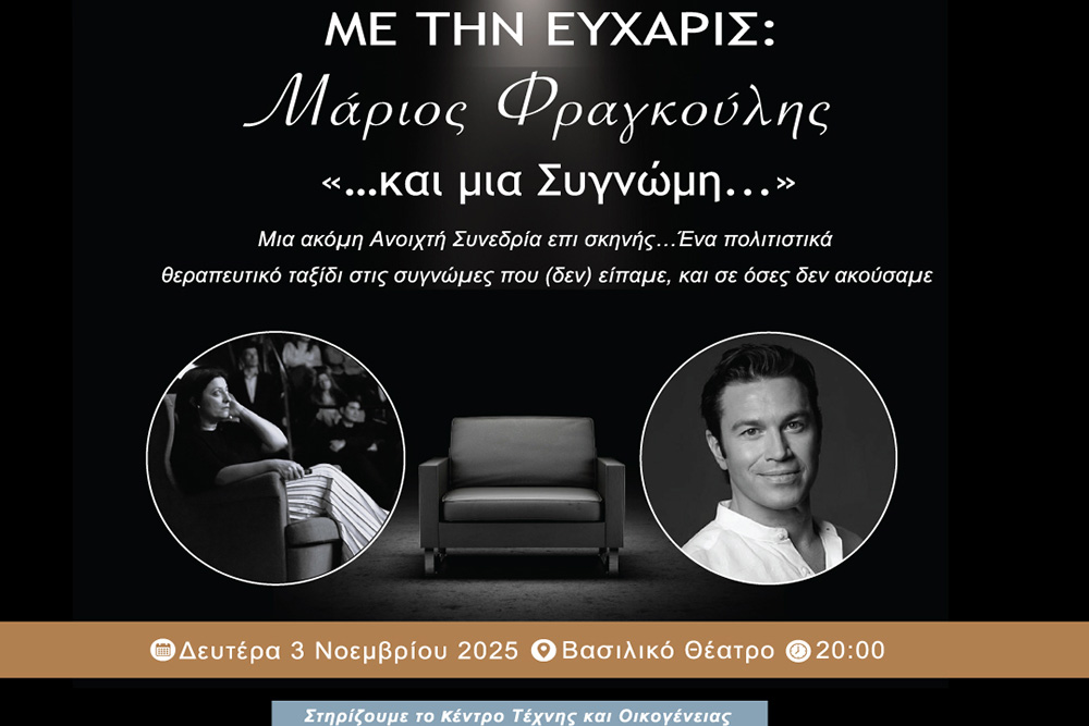 Στην πολυθρόνα με την Εύχαρις: «…και μία Συγνώμη…»Σε συνέχεια της μεγάλης ανταπόκρισης του κόσμου της Θεσσαλονίκης, στην Πολιτιστική Ψυχοθεραπεία («Στην πολυθρόνα με την Εύχαρις: Παιδεύουσι Τέκνα» και “Στην πολυθρόνα με την Εύχαρις: Εγώ…ο Μπαμπάς Μου”) η Πολυθρόνα με την Εύχαρις επιστρέφει στην Σκηνή του Βασιλικού Θεάτρου, με καλεσμένο τον Μάριο Φραγκούλη.