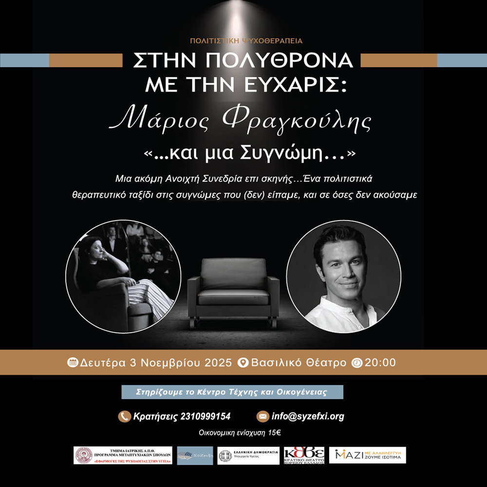 Η εκδήλωση “…Και μία Συγνώμη…” που θα γίνει στις 3/10/2025, στις 20:00 στο Βασιλικό Θέατρο, διοργανώνεται από το Κέντρο Επιστήμης Τέχνης, και Οικογένειας, ΣΥΖΕΥΞΗ, και το ΠΜΣ «Εφαρμογές της Ψυχολογίας στην Υγεία» του Τμήματος Ιατρικής ΑΠΘ.