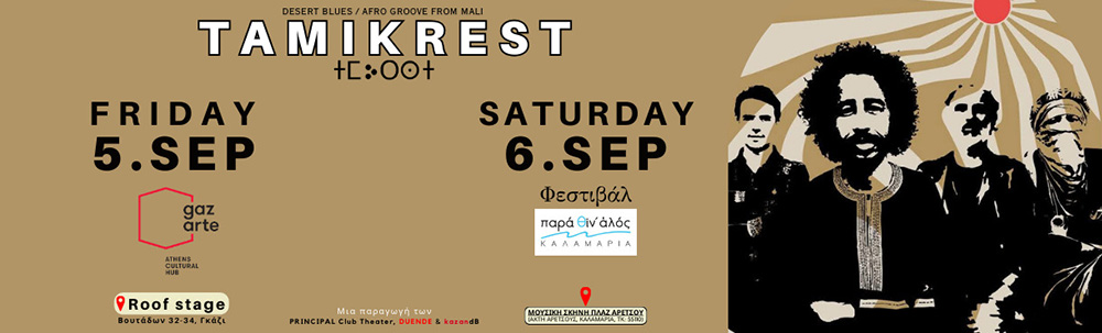 Ένας από τους σημαντικότερους εκπροσώπους των blues της μεγάλης ερήμου τα τελευταία χρόνια, με σήμα κατατεθέν την ιδιαίτερη μίξη της παραδοσιακής μουσικής των Touareg της ερήμου Σαχάρα με σύγχρονα στοιχεία της ροκ μουσικής, οι Tamikrest από το Mάλι της Δυτικής Αφρικής, θα εμφανιστούν για πρώτη φορά ζωντανά μπροστά στο κοινό της Θεσσαλονίκης!