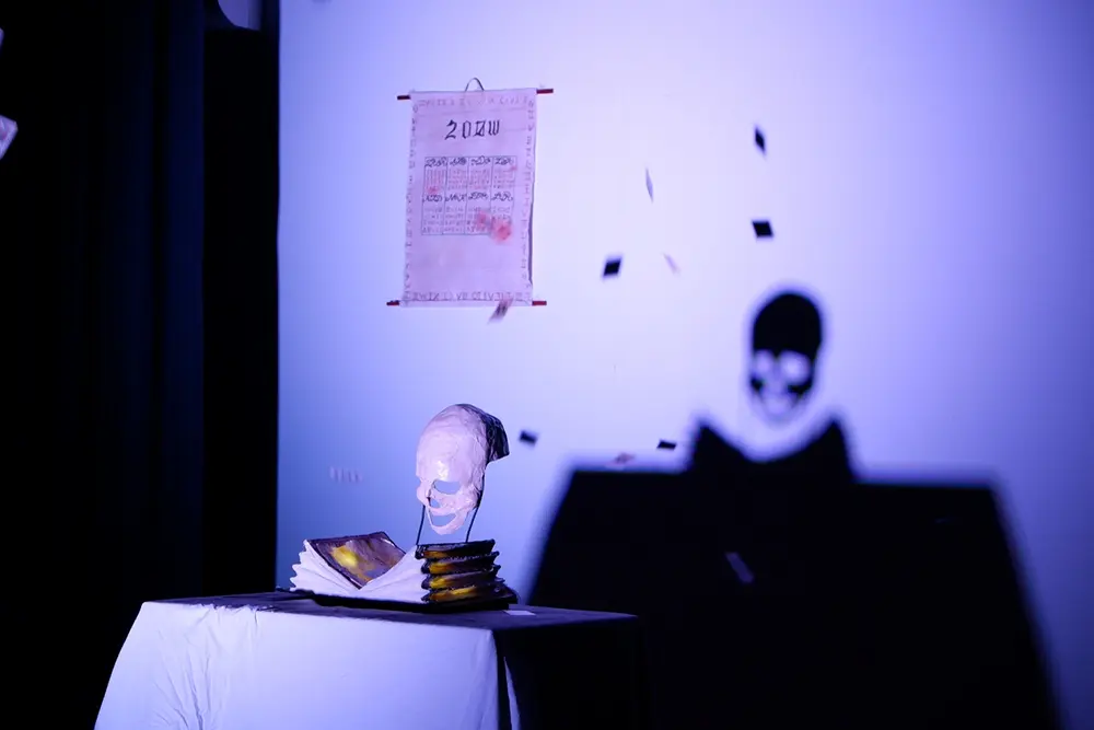 Σε έναν χώρο απομόνωσης και δημιουργίας, ένας Ποιητής συνομιλεί με μια παράδοξη παρουσία: Ένα κρανίο που μοιάζει να επιστρέφει από τη λήθη. Ανάμεσα στους δύο αναπτύσσεται ένας υπαινικτικός σκηνικός διάλογος όπου η μνήμη, η φθορά και η επιθυμία διασταυρώνονται.