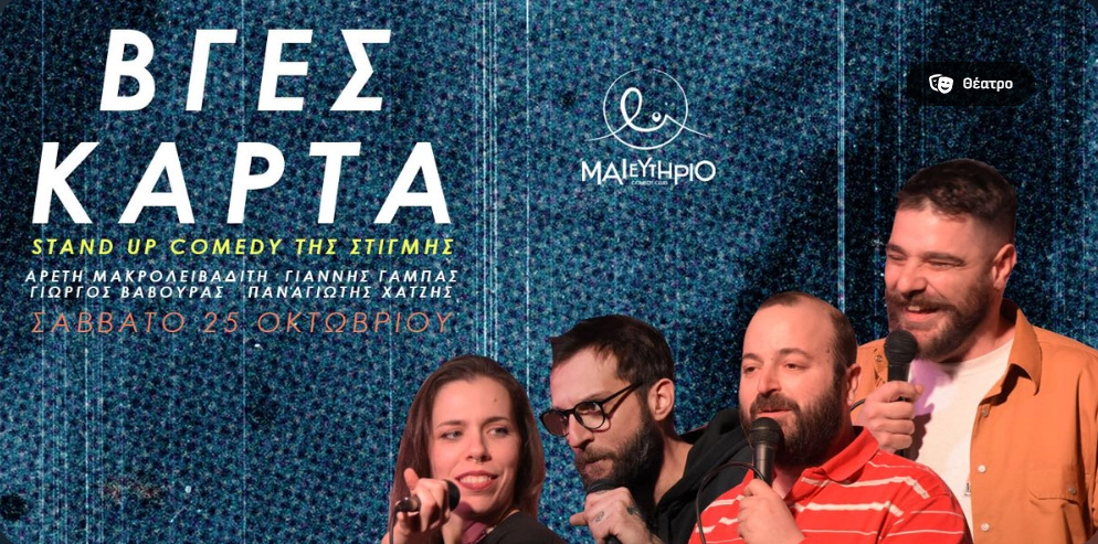 Βγες κάρταΈρχεται η πιο απρόβλεπτη και αστεία βραδιά της χρονιάς στο μοναδικό comedy club της πόλης, το Μαιευτήριο Comedy Club! Ετοιμαστείτε για μια παράσταση που ούτε οι ίδιοι οι κωμικοί δεν ξέρουν τι θα πουν! 4 κορυφαίοι stand-up comedians ανεβαίνουν στη σκηνή και θα αυτοσχεδιάσουν με βάση…μια κάρτα που θα εμφανίζεται στην οθόνη. Το θέμα της κάθε κάρτας; Έκπληξη! Το μόνο που είναι σίγουρο είναι ότι δεν έχουν καμία προετοιμασία και δεν ξέρουν τι θα αναγράφεται πάνω στις κάρτες. Μόνο με το ταλέντο και το χιούμορ τους, θα σας κάνουν να κλαίτε από τα γέλια!
