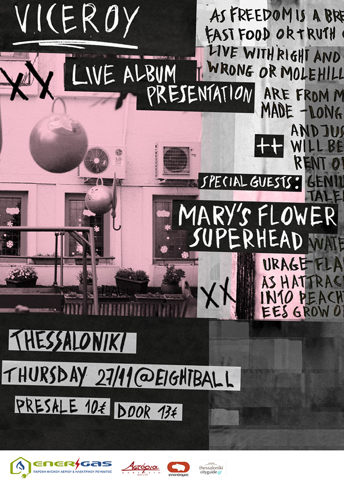 Οι Viceroy, το νεανικό τριμελές indie συγκρότημα από την Θεσσαλονίκη παρουσιάζει για πρώτη φορά ζωντανά το ντεμπούτο άλμπουμ του “Freedom Tastes Like Breakfast” στη σκηνή του Eightball Club. Στο πλευρό τους οι αγαπημένοι της εγχώριας σκηνής, Mary’s Flower Superhead.