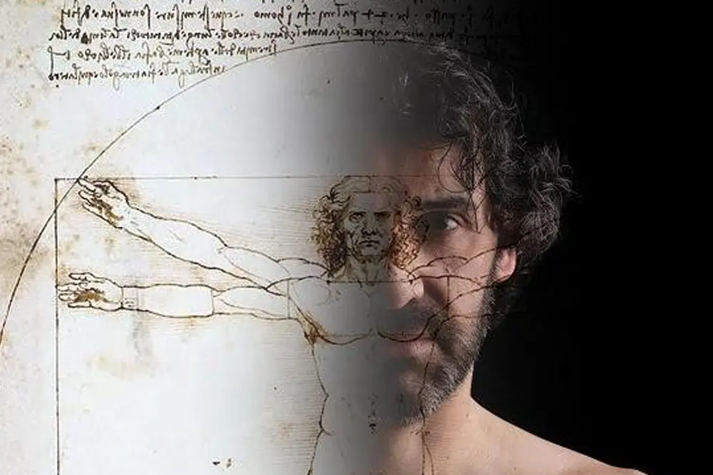 Στην παράσταση, που σκηνοθετεί ο Χρήστος Δήμας, ο Στέφανος Κακαβούλης ζωντανεύει επί σκηνής μια μυθοπλαστική ιστορία με πολλά πραγματικά και ιστορικά στοιχεία. Οι συμβολισμοί, οι αλληγορίες, τα αποκρυπτογραφημένα μηνύματα, οι κώδικες, η μεταφυσική διάσταση που κρύβονται πίσω από το συγκεκριμένο σχέδιο πλαισιώνουν τον Άντρα που πόζαρε στον ζωγράφο, δίνοντάς του σάρκα και οστά. Η παράσταση φωτίζει τη ψυχοσύνθεση, τις αγωνίες και τη ζωή του στη διάρκεια των συναντήσεών του με τον Da Vinci στο ατελιέ του μεγάλου δημιουργού. Με τη μορφή μονολόγου ο Άντρας – Βιτρούβιος απευθύνεται άμεσα στο κοινό σαν να είναι αυτό ο ζωγράφος.