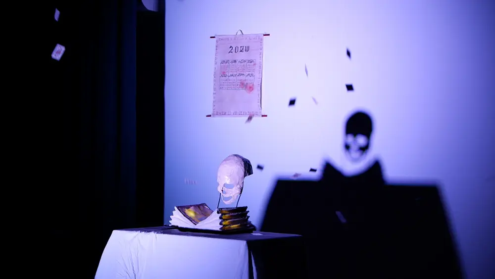 Σαν καλός ταχυδακτυλουργός δεν θέλω να σας αποκαλύψω εκ προοιμίου πώς γίνεται το μαγικό επί σκηνής. Όπως όμως σωστά εντοπίσατε, η παράσταση κινείται διαρκώς ανάμεσα στο φευγαλέο και το αιώνιο, ανάμεσα στην πραγματικότητα και την ψευδαίσθηση. Για να επιτευχθεί αυτή η αντίθεση, αυτή η αντιπαράθεση των δύο κόσμων, έχει γίνει πολλή μελέτη στους φωτισμούς και τις σκιάσεις που αυτοί δημιουργούν. Ακόμη, σημαντικό ρόλο, διαδραματίζει η χρήση της μάσκας (κατασκευή της Αννέτας Ιμπρισίμη), η οποία υποστηρίζεται από την ανάλογη κινησιολογική λειτουργία της ηθοποιού.